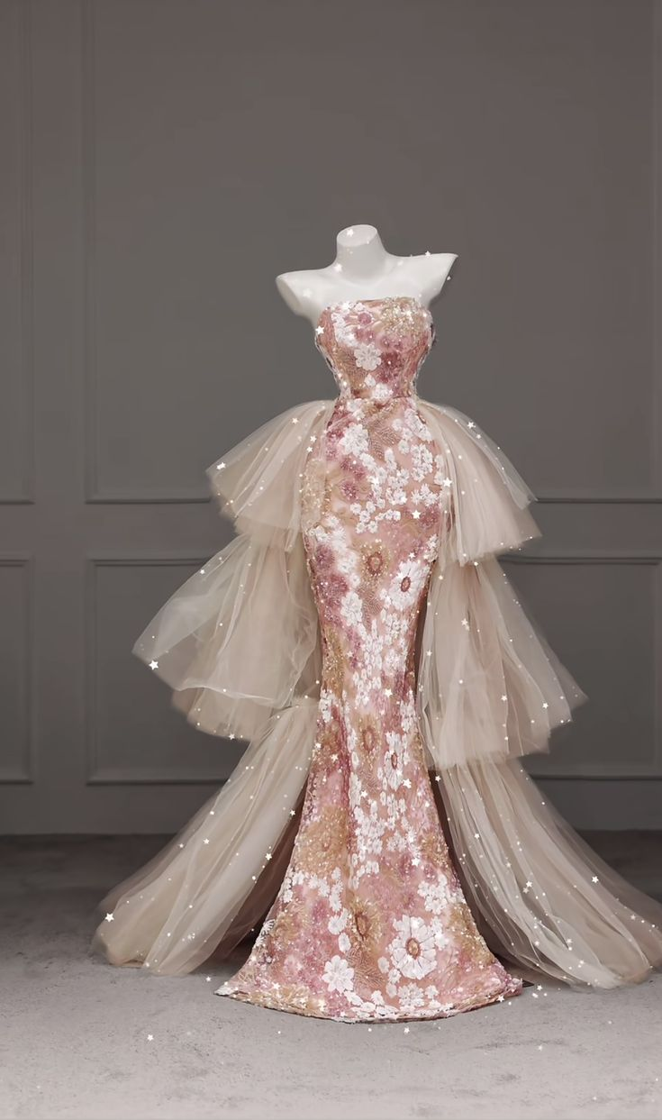 Charming Strapless Pink Tulle Lace Sequin Beaded Floral Mermaid Prom Dress Formal Birthday Party Dress D1194