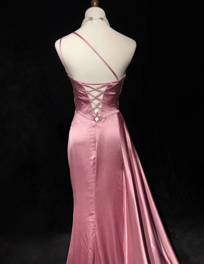 Chic One Shoulder Satin Sequin Beaded Mermaid Long Evening Dress Formal Pink Wedding Guest Dress D2073