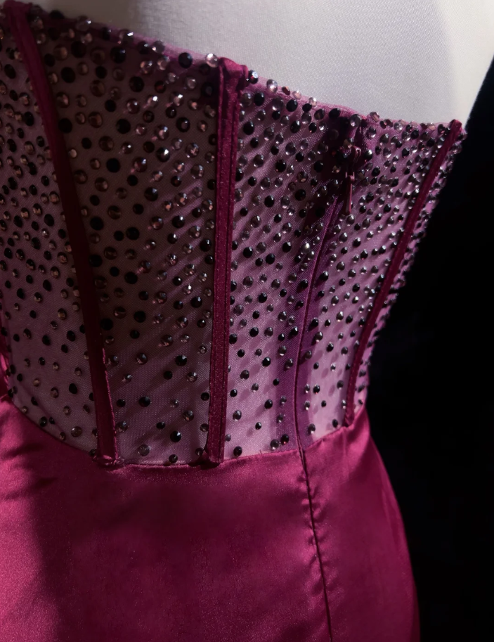 Elegant Strapless Hot Pink Satin Beaded Mermaid Long Wedding Guest Dress Formal Evening Dress D2058