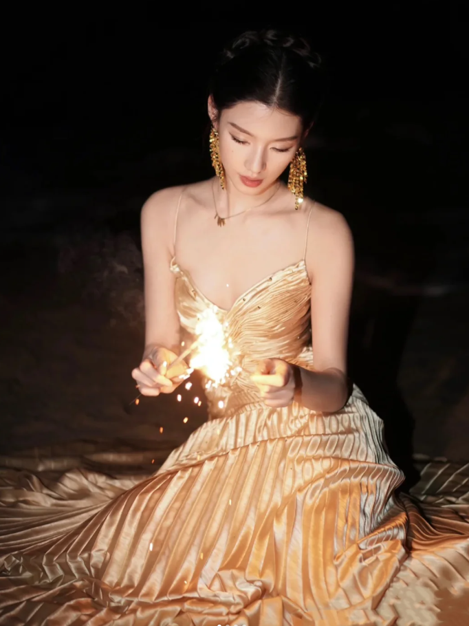 Fashion Spaghetti Straps V Neck Gold Satin Pleated Long Evening Dress Formal Wedding Guest Dress D2263