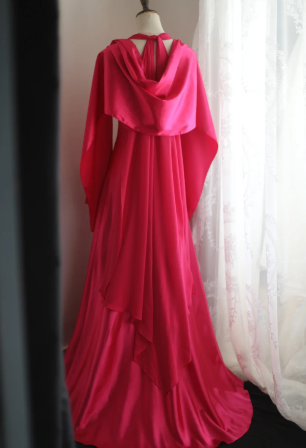 Glamorous Halter Hot Pink Satin Chiffon Mermaid Long Party Dress Formal Birthday Prom Gowns With Cape D2329