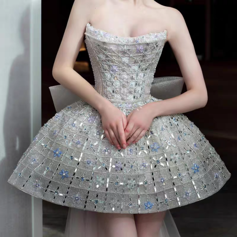 Glitter Strapless Tulle Beaded Mini Birthday Dress Pink Homecoming Dress With Bow S257