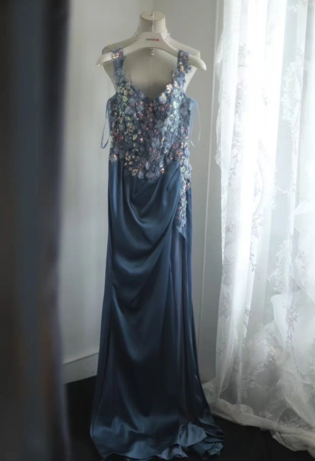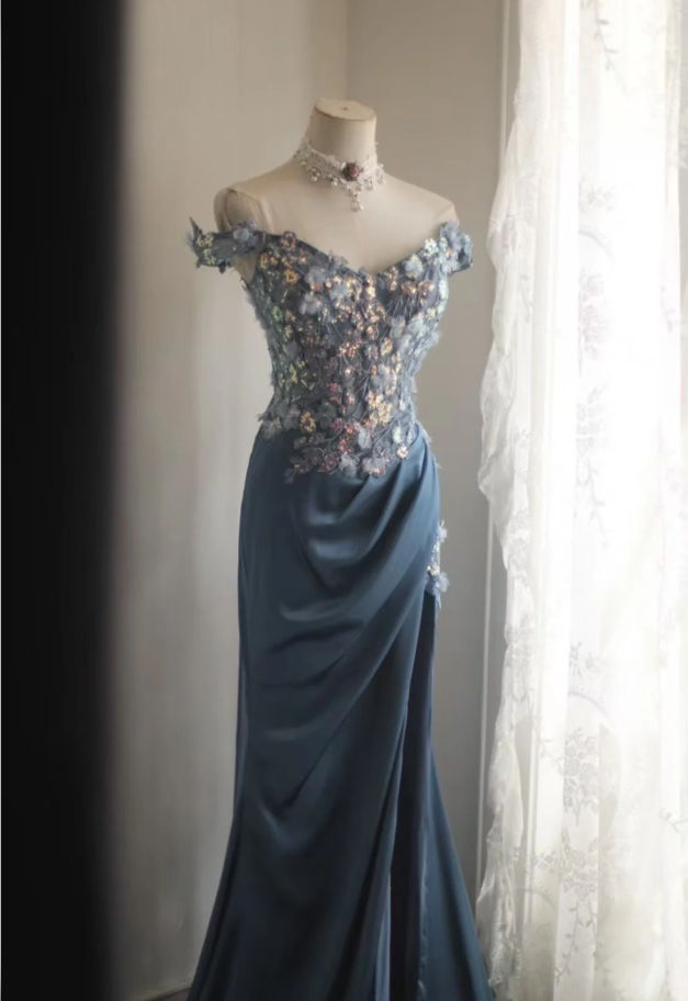 Gorgeous Off The Shoulder V Neck Satin Sequin Appliques Evening Dress Long Mermaid Slit Prom Dresses D2203