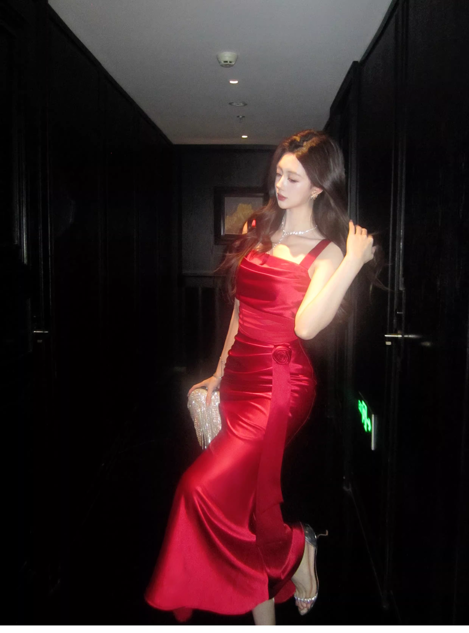 Pretty Red Spaghetti Straps Satin Pleated Mermaid Long Wedding Guest Dress Formal Evening Dress D2180