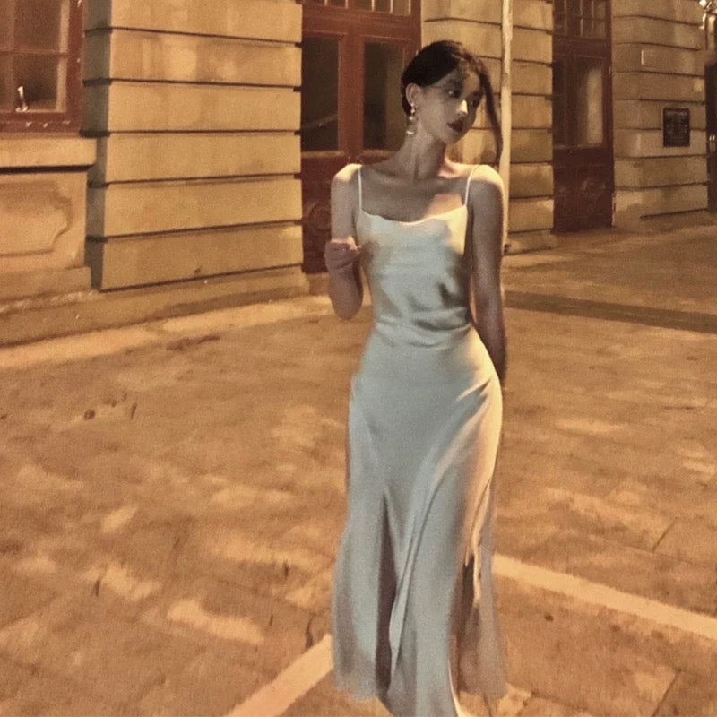 Retro A Line Spaghetti Straps Satin Party Dress Prom Dresses SD1382