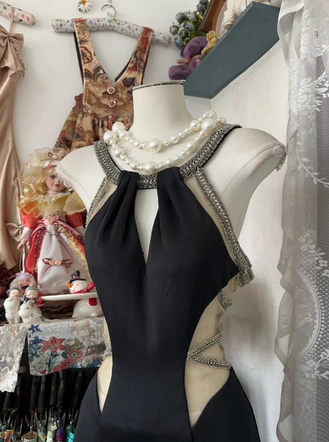 Sexy Black Sleeveless Satin Beaded Backless Mermaid Long Party Dress Evening Gown D1672