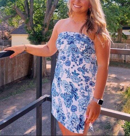 Unique Strapless Blue Satin Print Floral Sheath Short Cocktail Dress Formal Homecoming Dress D144