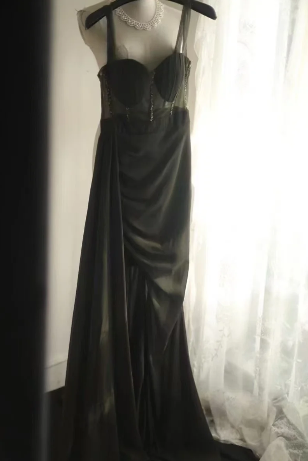Vintage Green Spaghetti Straps Satin Beaded Mermaid Slit Long Evening Dress Party Gown D2202