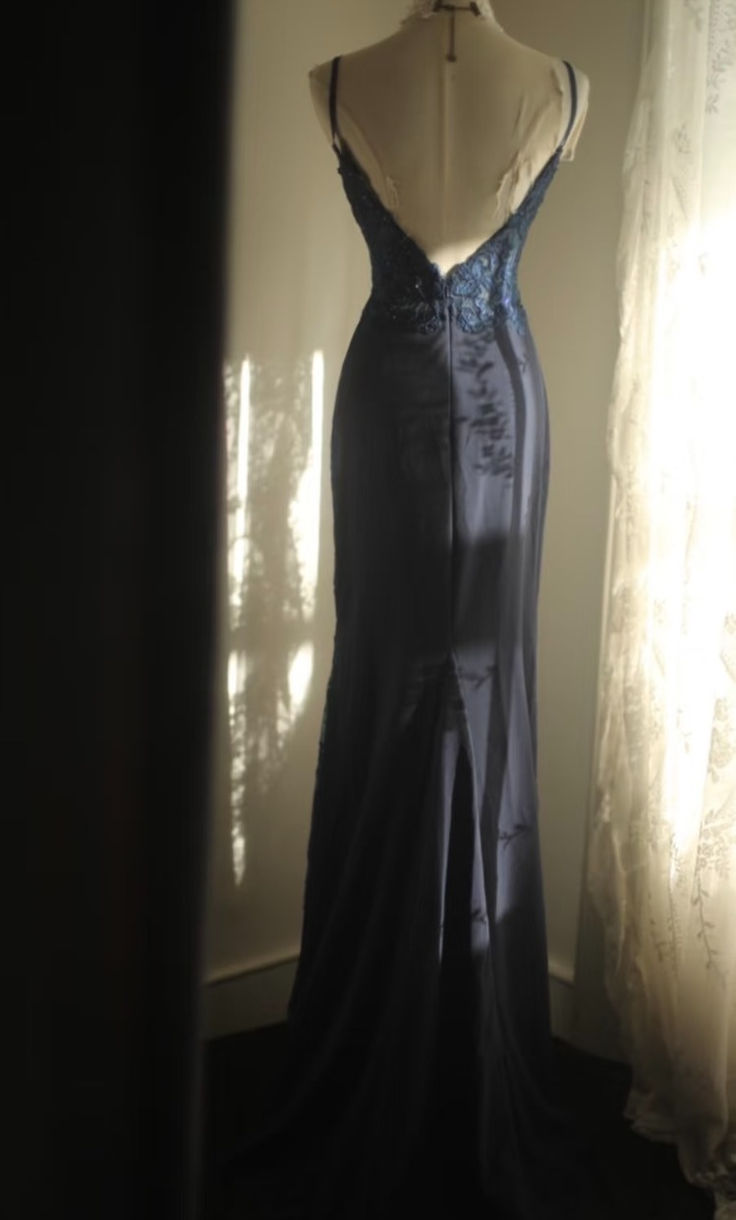 Vintage Spaghetti Strap Navy Blue Satin Appliques Mermaid Long Wedding Guest Dress Birthday Evening Dress D1979